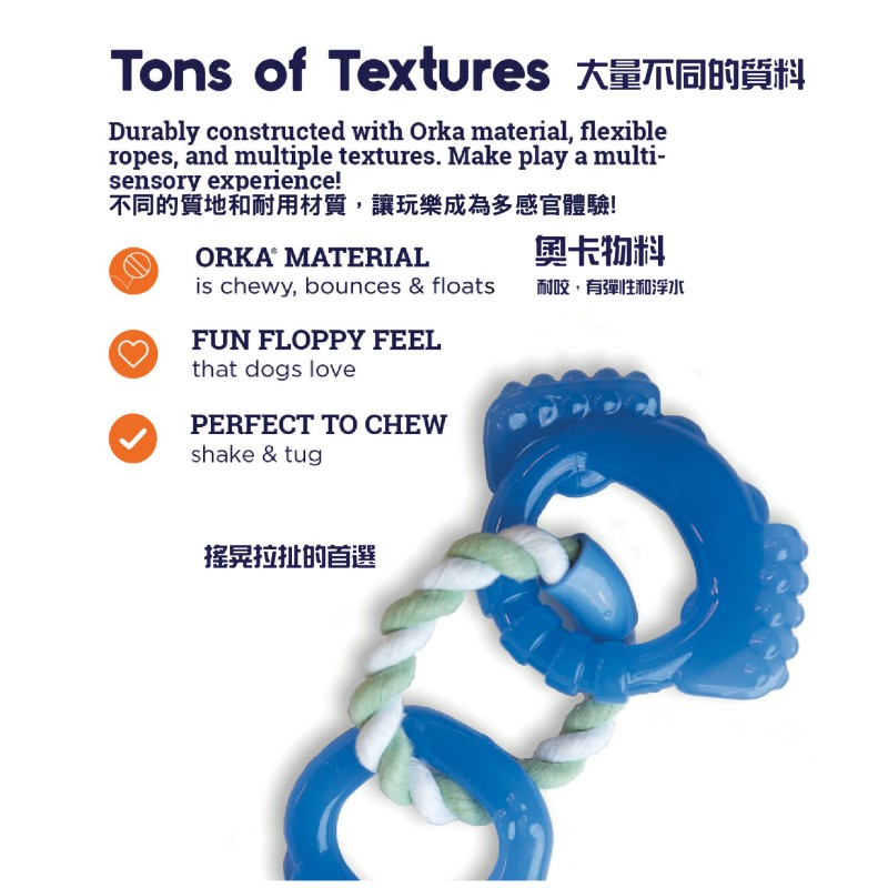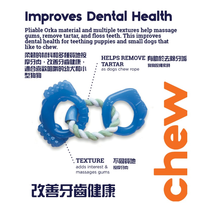 • tons of textures:Durably constructed with Orka material, flexible ropes, and multiple textures that make play interesting, our Petstages Mini Dentachew Pack makes for a great multi-sensory experience and fantastic fun for your pup!