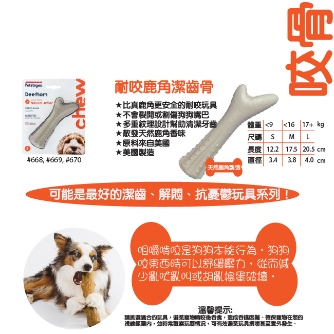 - 由自然脫落的鹿角製成,並帶有狗對鹿角咀嚼所喜愛的味道和氣味
