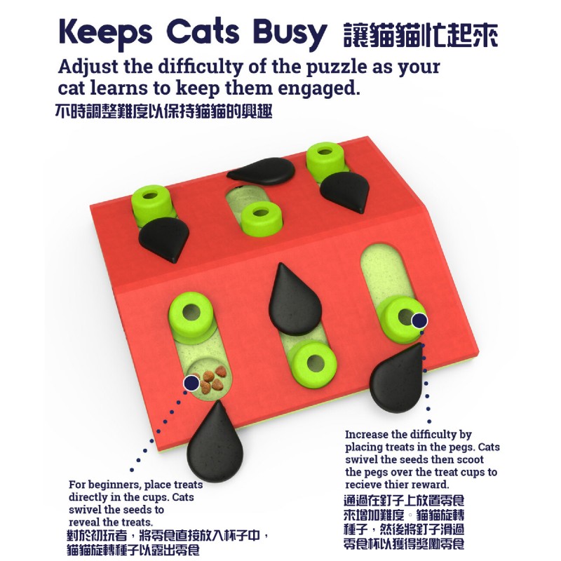 Cats bat at the pegs and swivel the black “seeds” of this dual-sided game to uncover treats in the 6 hidden treat compartments and inside the 6 pegs. Adjust the difficulty of the puzzle to make it easier for beginners or more challenging for smarty cats. Let the games begin!
